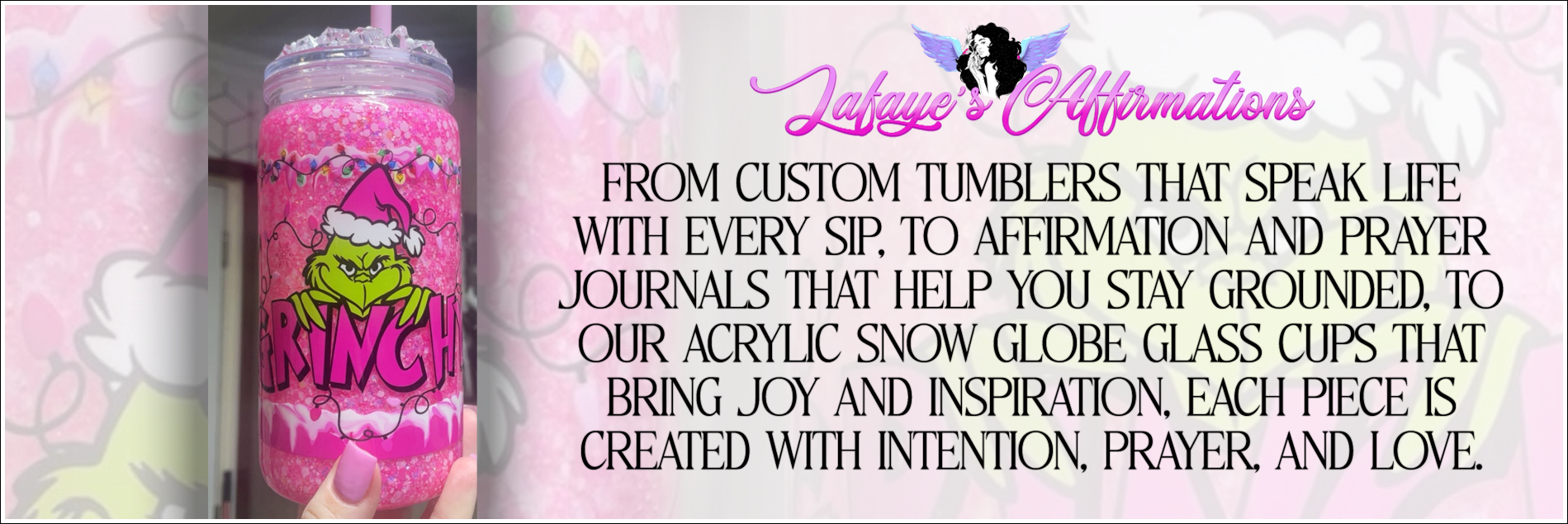 From custom tumblers that speak life with every sip, to affirmation and prayer journals that help you stay grounded, to our acrylic snow globe glass cups that bring joy and inspiration, each piece is created with intention, prayer, and love.