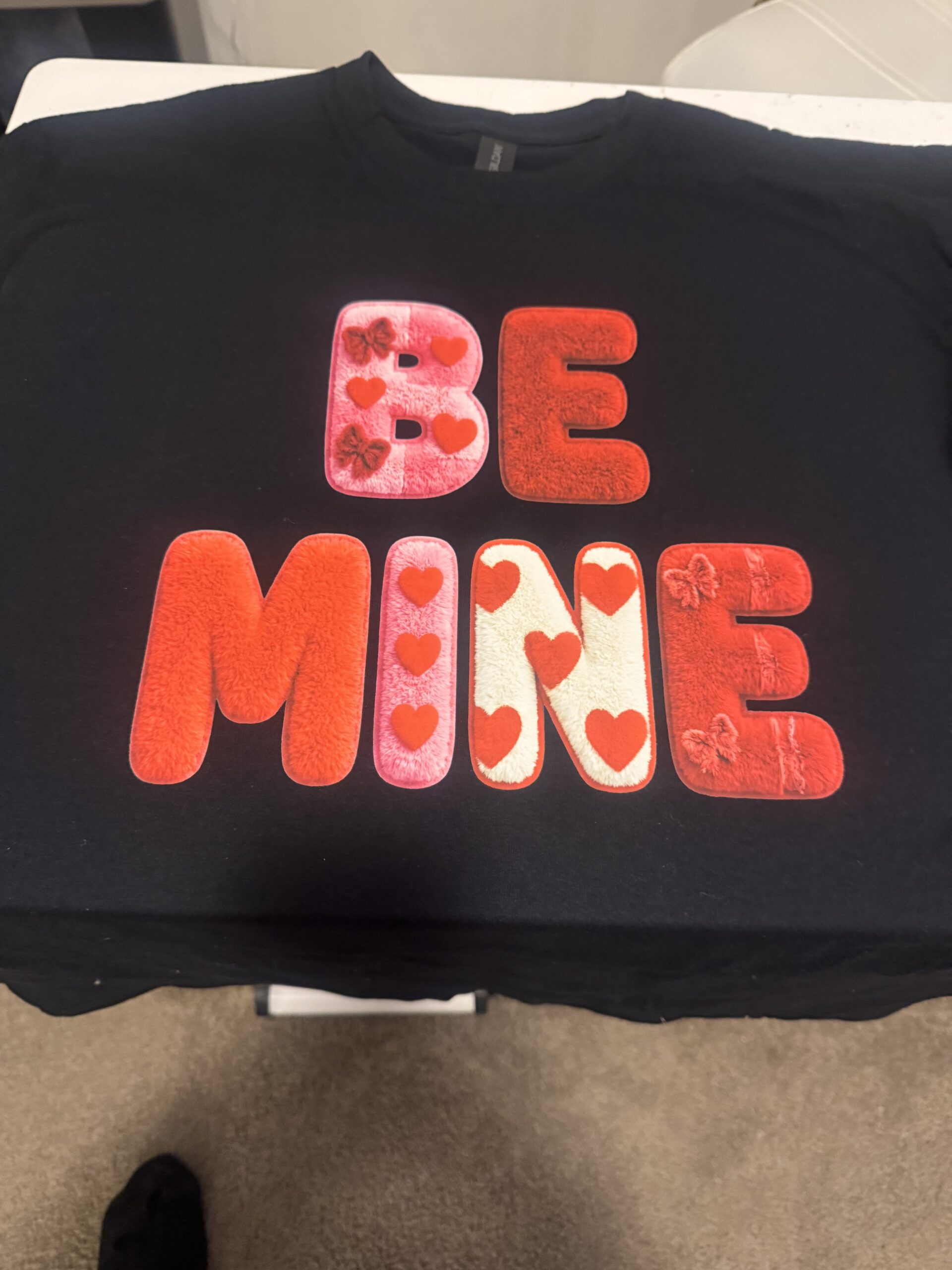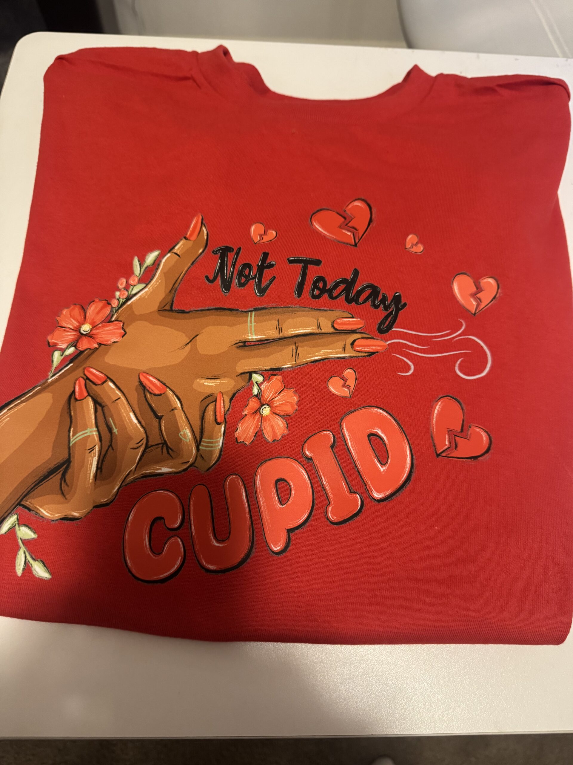 Short Sleeves Valentine Red T-Shirt in a size large with red hearts, flowers around the trigger, hands 100% cotton
